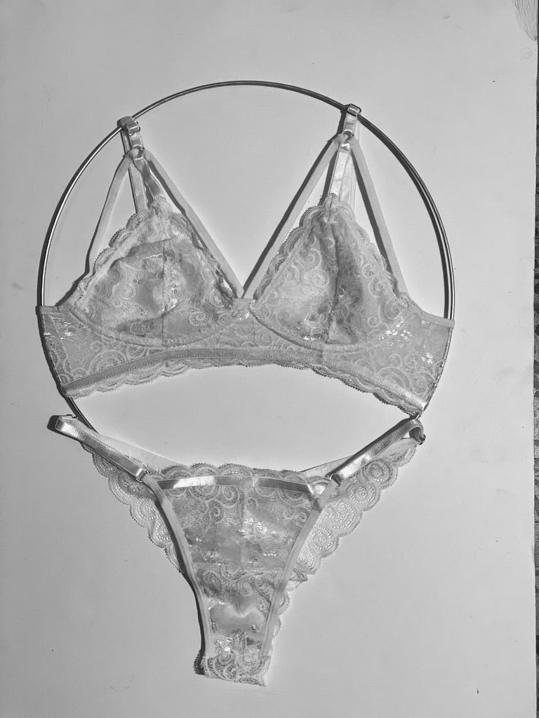 Set elaborado en encaje, sin copas. Tiene cargaderas graduables y panty mariposa. Su refuerzo está hecho 100% en algodón.