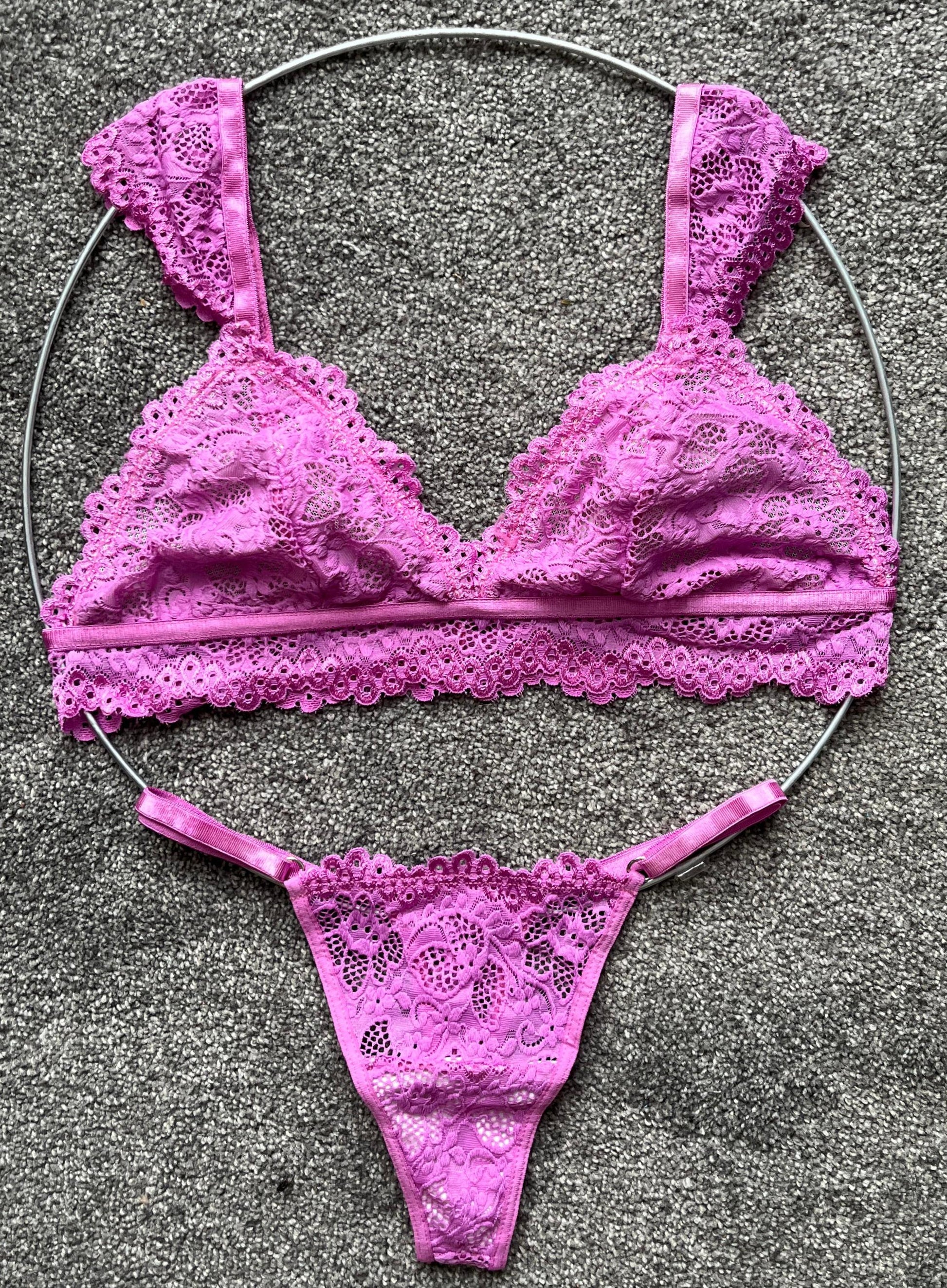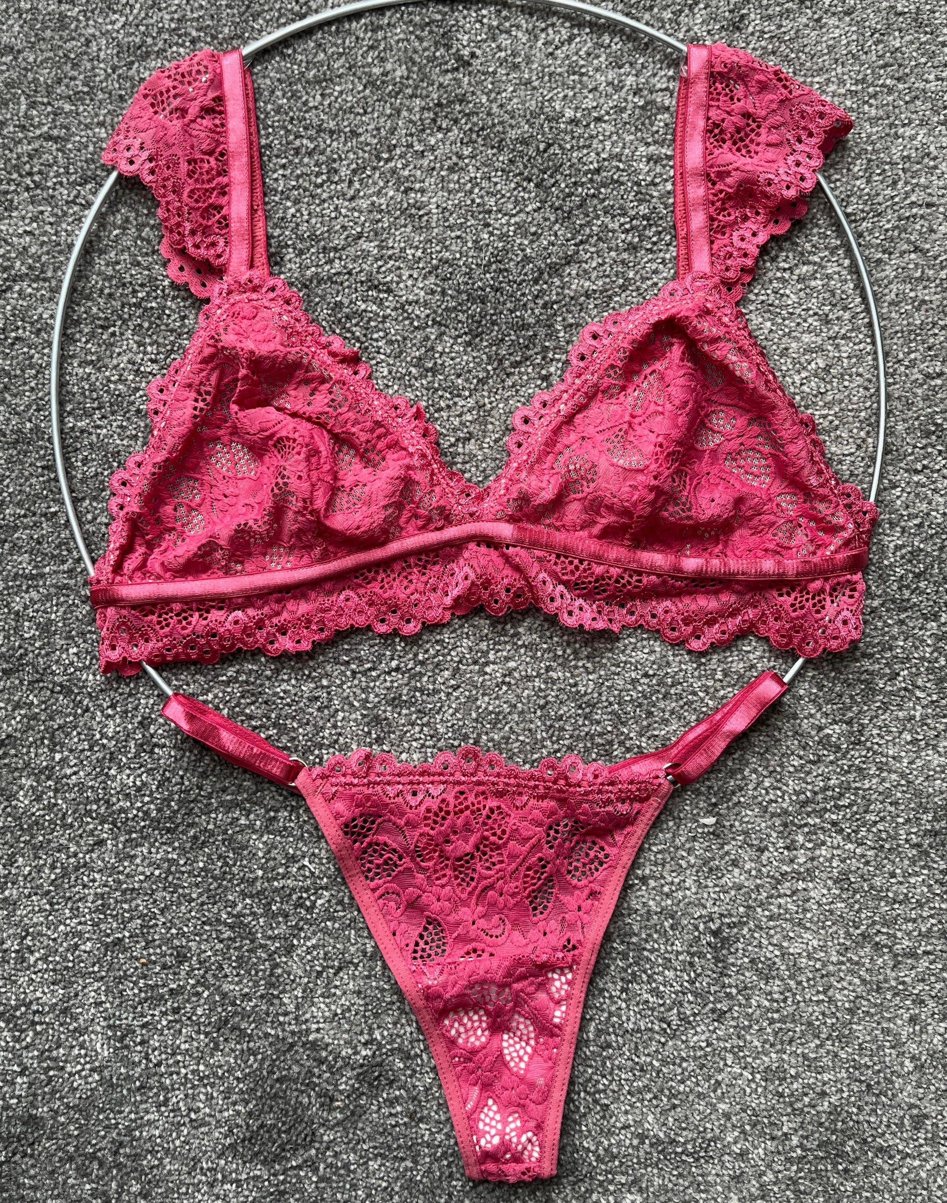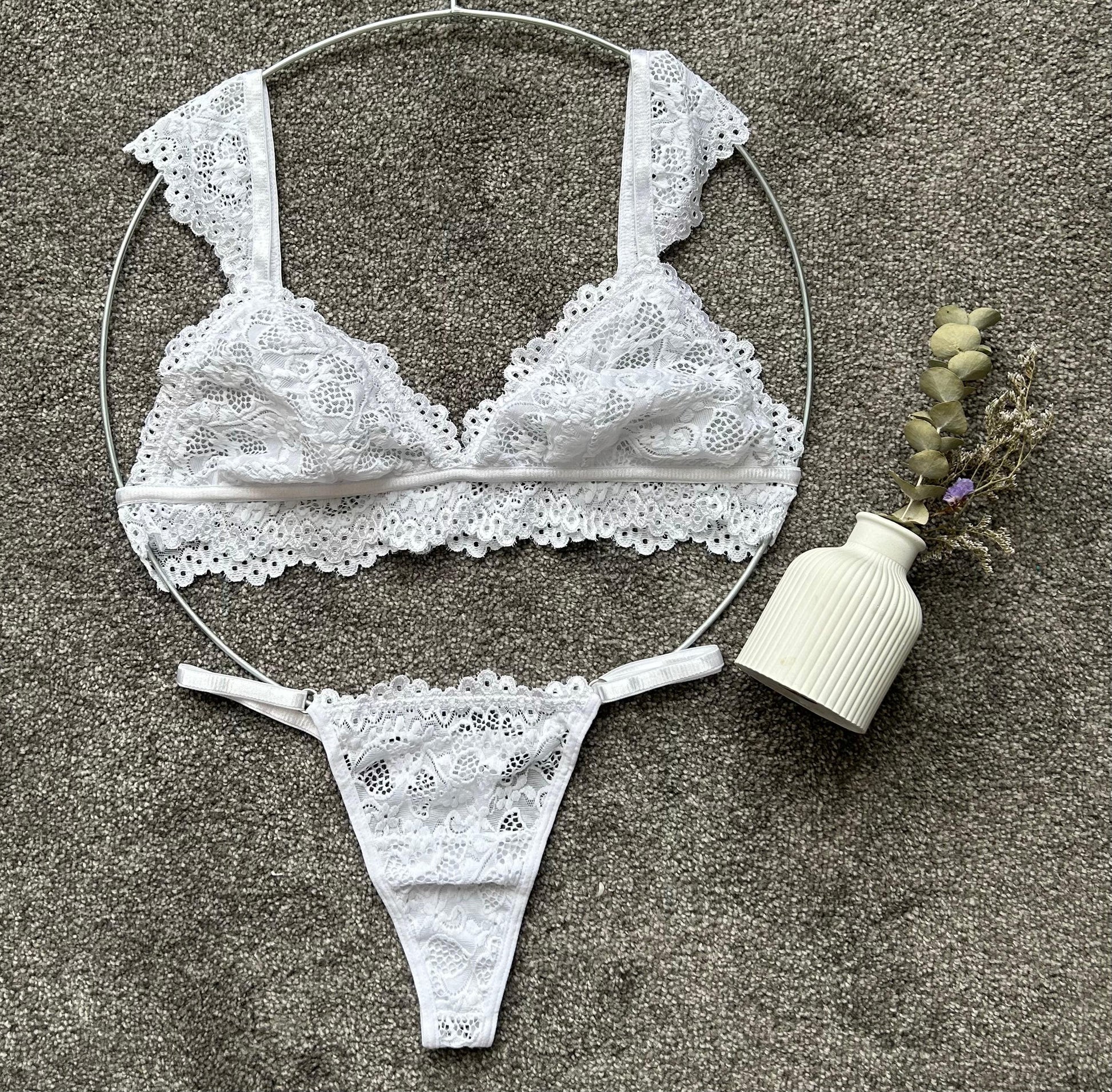 Set elaborado en encaje de alta calidad con delicados detalles florales, sin copas. Tiene unas delicadas hombreras y panty a juego con un diseño elegante y femenino, con bordes de encaje que ofrecen un acabado romántico, ideal para quienes buscan una combinación de estilo y comodidad con refuerzo hecho 100% en algodón.